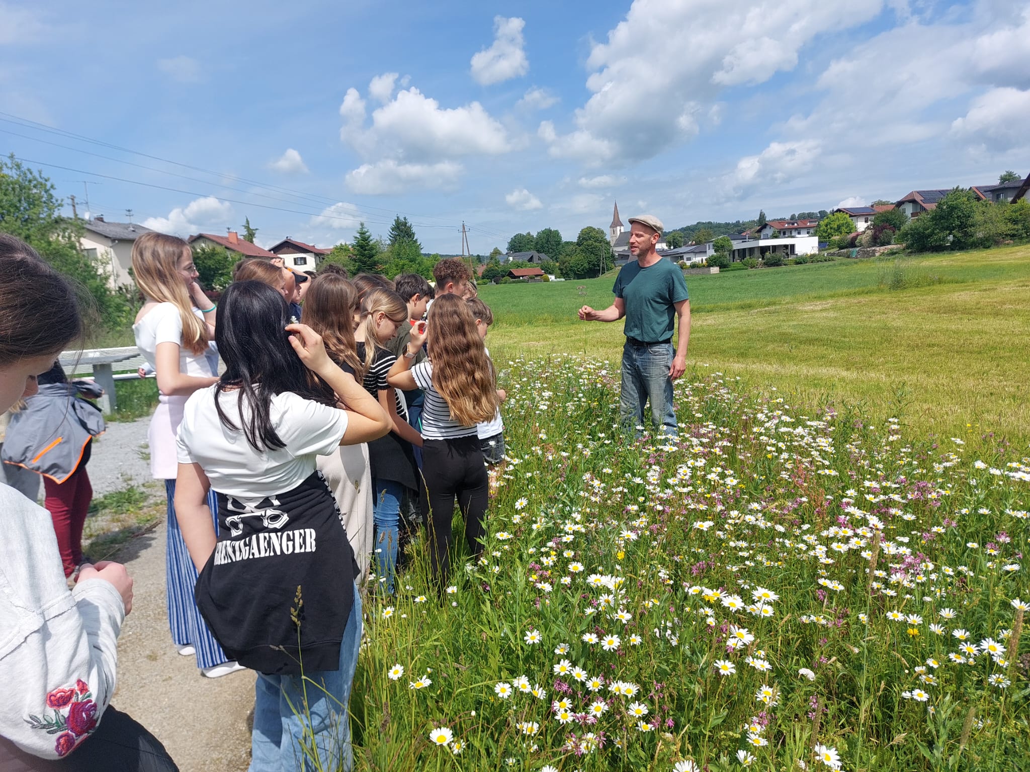 Gerade als der Blühstreifen seinem Namen am besten gerecht wurde haben 2 Klassen der Mittelschule einen Lokalaugenschein gemacht. Gemeinsam mit dem Bienenbeauftragten habe sie die Blütenpracht bestaunt und uns sich davon überzeugt, dass die im März gepflanzten Wildsträucher gut angewachsen sind und ausgetrieben sind.